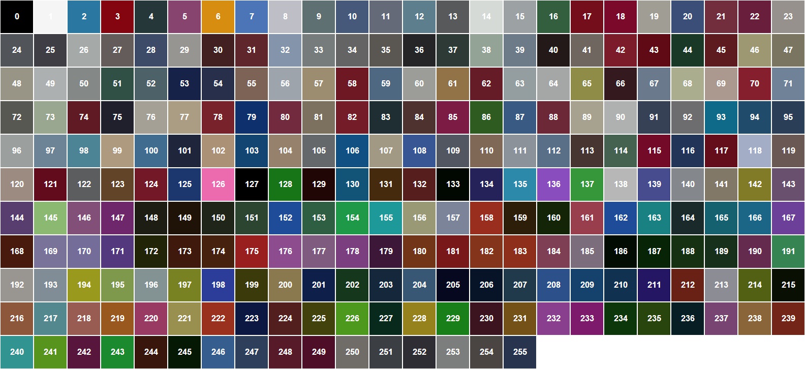 new VehicleColoursTableRGBA[256] = { // The existing colours from San Andreas 0x000000FF, 0xF5F5F5FF, 0x2A77A1FF, 0x840410FF, 0x263739FF, 0x86446EFF, 0xD78E10FF, 0x4C75B7FF, 0xBDBEC6FF, 0x5E7072FF, 0x46597AFF, 0x656A79FF, 0x5D7E8DFF, 0x58595AFF, 0xD6DAD6FF, 0x9CA1A3FF, 0x335F3FFF, 0x730E1AFF, 0x7B0A2AFF, 0x9F9D94FF, 0x3B4E78FF, 0x732E3EFF, 0x691E3BFF, 0x96918CFF, 0x515459FF, 0x3F3E45FF, 0xA5A9A7FF, 0x635C5AFF, 0x3D4A68FF, 0x979592FF, 0x421F21FF, 0x5F272BFF, 0x8494ABFF, 0x767B7CFF, 0x646464FF, 0x5A5752FF, 0x252527FF, 0x2D3A35FF, 0x93A396FF, 0x6D7A88FF, 0x221918FF, 0x6F675FFF, 0x7C1C2AFF, 0x5F0A15FF, 0x193826FF, 0x5D1B20FF, 0x9D9872FF, 0x7A7560FF, 0x989586FF, 0xADB0B0FF, 0x848988FF, 0x304F45FF, 0x4D6268FF, 0x162248FF, 0x272F4BFF, 0x7D6256FF, 0x9EA4ABFF, 0x9C8D71FF, 0x6D1822FF, 0x4E6881FF, 0x9C9C98FF, 0x917347FF, 0x661C26FF, 0x949D9FFF, 0xA4A7A5FF, 0x8E8C46FF, 0x341A1EFF, 0x6A7A8CFF, 0xAAAD8EFF, 0xAB988FFF, 0x851F2EFF, 0x6F8297FF, 0x585853FF, 0x9AA790FF, 0x601A23FF, 0x20202CFF, 0xA4A096FF, 0xAA9D84FF, 0x78222BFF, 0x0E316DFF, 0x722A3FFF, 0x7B715EFF, 0x741D28FF, 0x1E2E32FF, 0x4D322FFF, 0x7C1B44FF, 0x2E5B20FF, 0x395A83FF, 0x6D2837FF, 0xA7A28FFF, 0xAFB1B1FF, 0x364155FF, 0x6D6C6EFF, 0x0F6A89FF, 0x204B6BFF, 0x2B3E57FF, 0x9B9F9DFF, 0x6C8495FF, 0x4D8495FF, 0xAE9B7FFF, 0x406C8FFF, 0x1F253BFF, 0xAB9276FF, 0x134573FF, 0x96816CFF, 0x64686AFF, 0x105082FF, 0xA19983FF, 0x385694FF, 0x525661FF, 0x7F6956FF, 0x8C929AFF, 0x596E87FF, 0x473532FF, 0x44624FFF, 0x730A27FF, 0x223457FF, 0x640D1BFF, 0xA3ADC6FF, 0x695853FF, 0x9B8B80FF, 0x620B1CFF, 0x5B5D5EFF, 0x624428FF, 0x731827FF, 0x1B376DFF, 0xEC6AAEFF, 0x000000FF, // SA-MP extended colours (0.3x) 0x177517FF, 0x210606FF, 0x125478FF, 0x452A0DFF, 0x571E1EFF, 0x010701FF, 0x25225AFF, 0x2C89AAFF, 0x8A4DBDFF, 0x35963AFF, 0xB7B7B7FF, 0x464C8DFF, 0x84888CFF, 0x817867FF, 0x817A26FF, 0x6A506FFF, 0x583E6FFF, 0x8CB972FF, 0x824F78FF, 0x6D276AFF, 0x1E1D13FF, 0x1E1306FF, 0x1F2518FF, 0x2C4531FF, 0x1E4C99FF, 0x2E5F43FF, 0x1E9948FF, 0x1E9999FF, 0x999976FF, 0x7C8499FF, 0x992E1EFF, 0x2C1E08FF, 0x142407FF, 0x993E4DFF, 0x1E4C99FF, 0x198181FF, 0x1A292AFF, 0x16616FFF, 0x1B6687FF, 0x6C3F99FF, 0x481A0EFF, 0x7A7399FF, 0x746D99FF, 0x53387EFF, 0x222407FF, 0x3E190CFF, 0x46210EFF, 0x991E1EFF, 0x8D4C8DFF, 0x805B80FF, 0x7B3E7EFF, 0x3C1737FF, 0x733517FF, 0x781818FF, 0x83341AFF, 0x8E2F1CFF, 0x7E3E53FF, 0x7C6D7CFF, 0x020C02FF, 0x072407FF, 0x163012FF, 0x16301BFF, 0x642B4FFF, 0x368452FF, 0x999590FF, 0x818D96FF, 0x99991EFF, 0x7F994CFF, 0x839292FF, 0x788222FF, 0x2B3C99FF, 0x3A3A0BFF, 0x8A794EFF, 0x0E1F49FF, 0x15371CFF, 0x15273AFF, 0x375775FF, 0x060820FF, 0x071326FF, 0x20394BFF, 0x2C5089FF, 0x15426CFF, 0x103250FF, 0x241663FF, 0x692015FF, 0x8C8D94FF, 0x516013FF, 0x090F02FF, 0x8C573AFF, 0x52888EFF, 0x995C52FF, 0x99581EFF, 0x993A63FF, 0x998F4EFF, 0x99311EFF, 0x0D1842FF, 0x521E1EFF, 0x42420DFF, 0x4C991EFF, 0x082A1DFF, 0x96821DFF, 0x197F19FF, 0x3B141FFF, 0x745217FF, 0x893F8DFF, 0x7E1A6CFF, 0x0B370BFF, 0x27450DFF, 0x071F24FF, 0x784573FF, 0x8A653AFF, 0x732617FF, 0x319490FF, 0x56941DFF, 0x59163DFF, 0x1B8A2FFF, 0x38160BFF, 0x041804FF, 0x355D8EFF, 0x2E3F5BFF, 0x561A28FF, 0x4E0E27FF, 0x706C67FF, 0x3B3E42FF, 0x2E2D33FF, 0x7B7E7DFF, 0x4A4442FF, 0x28344EFF };