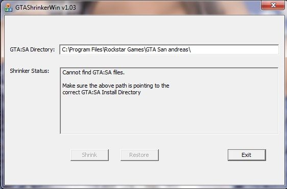 Распакуйте программу и запустите GTAShrinker.exe, затем укажите путь к игре и нажмите Shrink.
